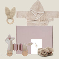De cadeaubox opent met een zachte en luxueuze vintage pink badjas van het gerenommeerde merk Little Dutch. Deze badjas is niet alleen heerlijk comfortabel, maar ook functioneel, perfect voor de momenten na het badderen of om de kleintjes warm te houden tijdens de frissere ochtenden. Wat deze badjas echt bijzonder maakt, is de mogelijkheid om deze te personaliseren met de naam van de baby. Een geborduurde naam maakt van deze badjas een uniek en dierbaar aandenken. Ouders zullen dit gepersonaliseerde detail zeker waarderen, en het maakt de badjas tot een gekoesterd item in de babyuitzet.