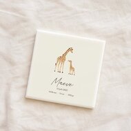 De geboorte tegel – Giraffen is een ode aan liefde, verbondenheid en een nieuw begin. De zachte illustratie, de persoonlijke gegevens en de hoogwaardige afwerking maken dit tot een waardevol, origineel kraamcadeau dat jarenlang gekoesterd wordt.
