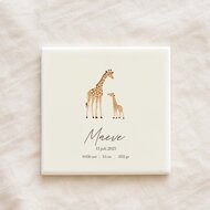 De geboortetegel – Giraffen is een ode aan liefde, verbondenheid en een nieuw begin. De zachte illustratie, de persoonlijke gegevens en de hoogwaardige afwerking maken dit tot een waardevol, origineel kraamcadeau dat jarenlang gekoesterd wordt.