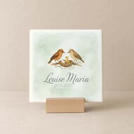De groene geboortetegel – Vogelnestje is ontworpen met oog voor detail. De illustratie toont een zacht getekend vogelnestje met kleine vogeltjes, subtiel en liefdevol uitgevoerd. Deze symboliek, nieuw leven, veiligheid en groeien onder warme vleugels, maakt de tegel extra betekenisvol.