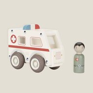 De houten ambulance heeft een lengte van ongeveer 13,5 cm en is licht van gewicht, zodat kleine kinderhandjes het makkelijk kunnen vasthouden. Het speelgoed is gemaakt van stevig hout en voorzien van rubberen strips op de wielen. Dat zorgt niet alleen voor extra grip, maar beschermt ook de vloer tegen krassen. Bij de ambulance wordt een klein poppetje meegeleverd, zodat kinderen nog meer kunnen fantaseren en rollenspel kunnen spelen. Geschikt vanaf 18 maanden.