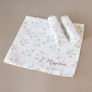 Het personaliseren gebeurt op een subtiele en stijlvolle manier, zodat het elegant blijft en perfect past bij de zachte bloemillustraties. Dit maakt de doeken niet alleen praktisch, maar ook een emotioneel waardevol item dat een prominente plek kan krijgen in het dagelijks leven van de baby.
