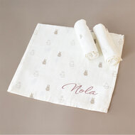 - Een van de hydrofiele doeken wordt geborduurd met naam