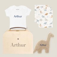 Met de kraamcadeau koffertje - Dino geef je een prachtig en doordacht cadeau dat elke nieuwe ouder zal waarderen. Dit mooie pakket vol nuttige en schattige items zal zeker in de smaak vallen en wordt een waardevolle aanvulling op de babyuitzet. Maak het moment van kraambezoek nog specialer met dit unieke kraamcadeau!