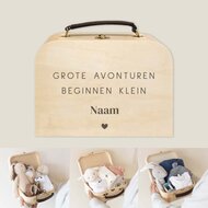 Weet je niet precies wat je moet kiezen als kraamcadeau en wil je een bijzonder en mooi praamcadeau geven? Kies dan voor het verrassingspakket van Kraamcadeau! Al onze verrassingspakketten bevatten zorgvuldig gekozen items die samen een prachtig kraampakket vormen. Alle babycadeaus worden verpakt in een stijlvol houten koffertje dat we graveren met het leuke ontwerp "Grote avonturen beginnen klein". Je kunt er voor kiezen om voor €3,95 extra een eigen ontwerp te laten graveren met naam. Zo geef je een persoonlijk kraamcadeau waar zowel de ouders als het kleintje volop van kunnen genieten.
